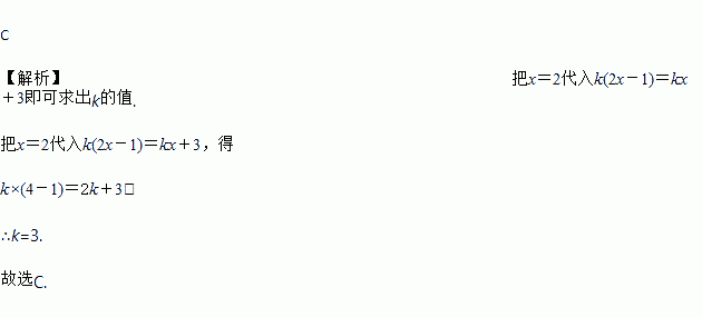 若x=2是方程k(2x-1)=kx+3的解,则k的值为( )