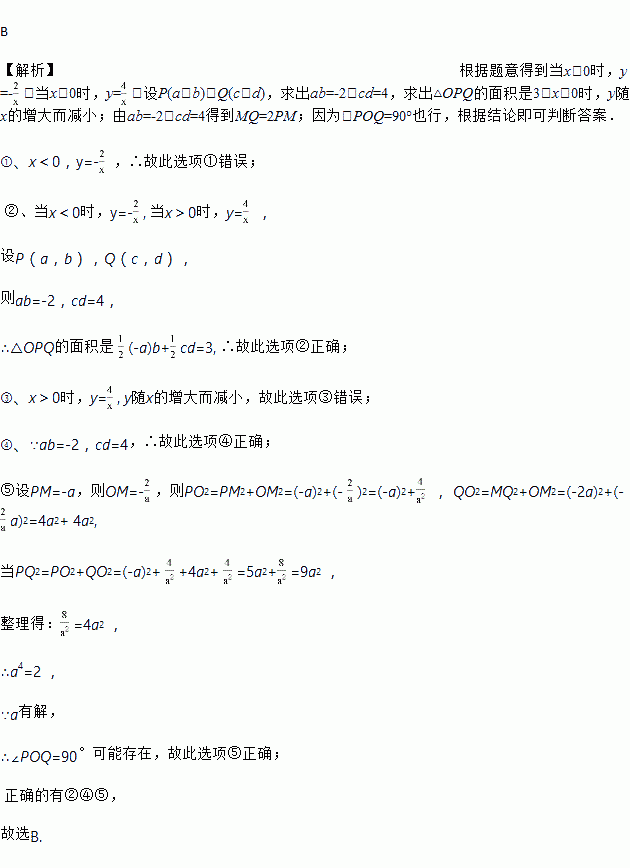 ;②△OPQ的面积为定值;③当x>0时,y的值随x值的增大而增大;④MQ=2PM;⑤∠POQ可以等于90°.其中正确的结论是( )