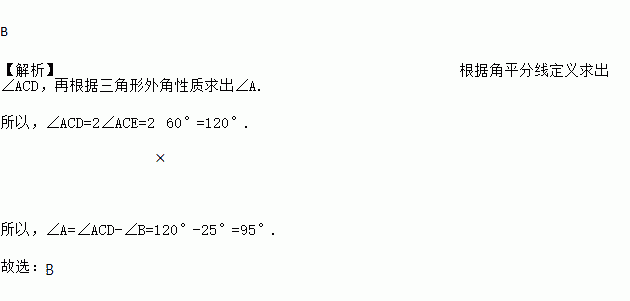 如图,CE是△ABC的外角∠ACD的平分线,若∠B=25°,∠ACE=60°,则∠A=( )