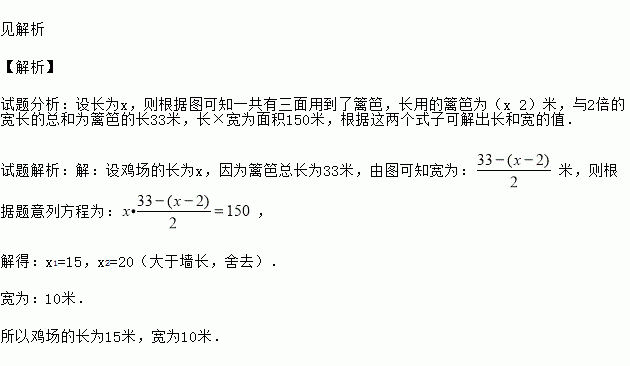 如图,有一个面积为150㎡的长方形鸡场,鸡场的一边靠墙(墙长18,米),墙的对面有一个2米宽的门,另外三边(门除外)用篱笆围成,篱笆总长为33米,求鸡场的长与宽分别是多少?
