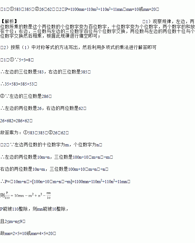 (2)设数字对称式左边的两位数的十位数字为m,个位数字为n,且2≤m+n≤9.用含m,n的代数式表示数字对称式左边的两位数与三位数的乘积P,并求出P 能被110整除时mn的值.(其中乘法公式