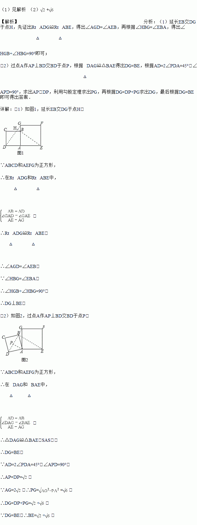 (2)如图2,小明将正方形ABCD绕点A逆时针旋转,当点B恰好落在线段DG上时,请你帮他求出此时BE的长.
