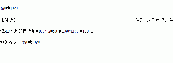 在⊙O中,圆心角∠AOB=100°,则弦AB所对的圆周角=_____.