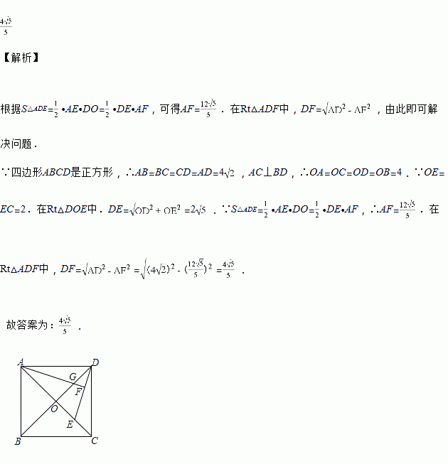 如图,正方形ABCD的两条对角线相交于点O.点E是OC的中点,连接DE,过点A作AF⊥DE于点F,交OD于点G.若正方形的边长为,则DF=__________.