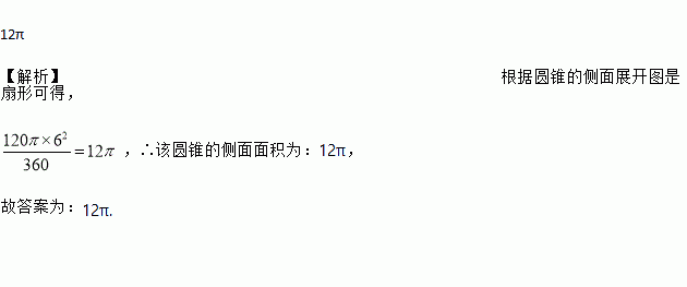 12π 【解析】根据圆锥的侧面展开图是扇形可得, ,∴该圆锥的侧面面积为:12π, 故答案为:12π.