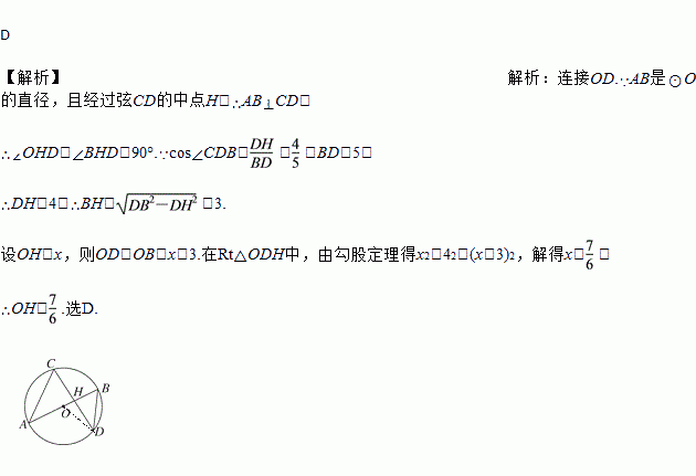 如图,AB是⊙O的直径,且经过弦CD的中点H,已知cos∠CDB=,BD=5,则OH的长为( )