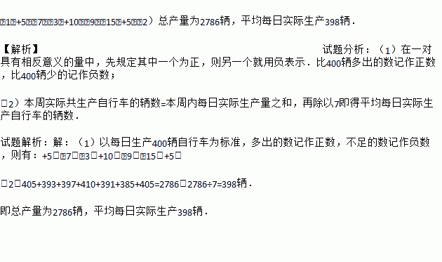 (1)+5,﹣7,﹣3,+10,﹣9,﹣15,+5;(2)总产量为2786辆,平均每日实际生产398辆. 【解析】试题分析:(1)在一对具有相反意义的量中,先规定其中一个为正,则另一个就用负表示.比400辆多出的数记作正数,比400辆少的记作负数; (2)本周实际共生产自行车的辆数=本周内每日实际生产量之和,再除以7即得平均每日实际生产自行车的辆数. 试题解析:【解析】 (1)...