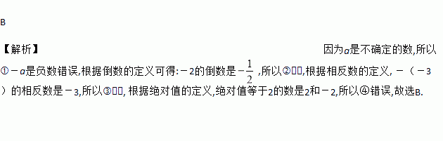 B 【解析】因为a是不确定的数,所以?-a是负数错误,根据倒数的定义可得:-2的倒数是,所以?正确,根据相反数的定义, -(-3)的相反数是-3,所以?正确, 根据绝对值的定义,绝对值等于2的数是2和-2,所以④错误,故选B.