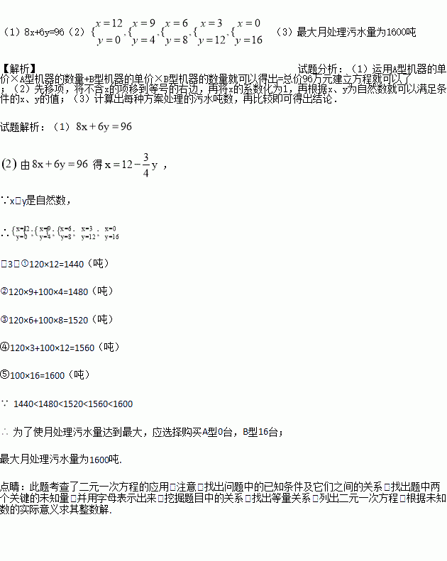 “五水共治”是浙江省委十三届四次全会提出,要以治污水、防洪水、排涝水、保供水、抓节水的大规模治水行动.五水共治,治污先行。市政府决定用96万元钱购买处理污水设备.现有A,B两种型号的处理污水设备,其中每台的价格、月处理污水量如下表.