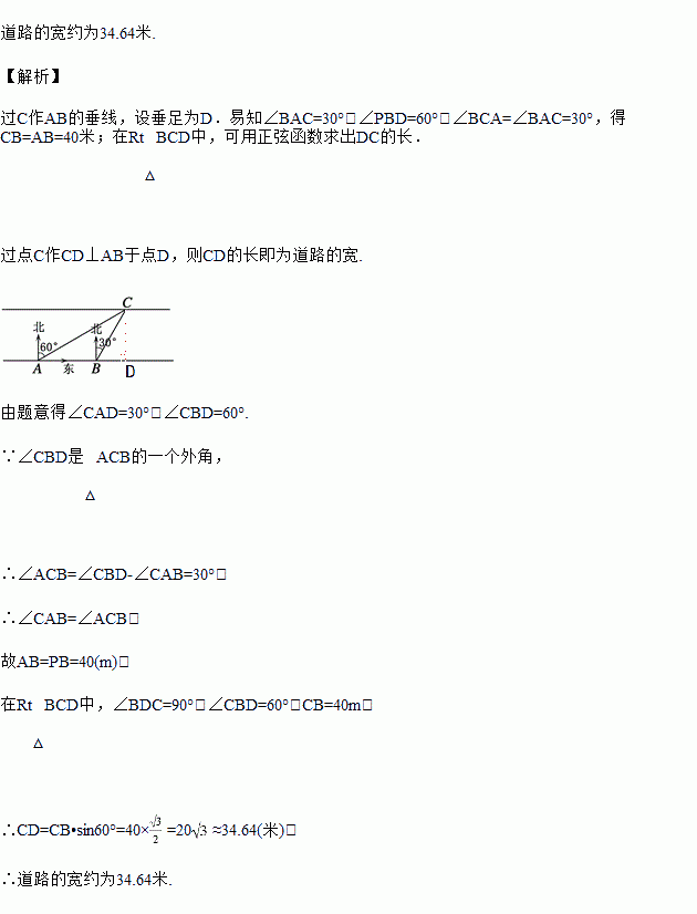 如图,甲、乙两人在道路的两边相向而行,当甲、乙两人分别行至点A、C时,测得乙在甲的北偏东60°方向上.乙留在原地休息,甲继续向前走了40米到B处,此时测得乙在其北偏东30°方向上.求道路的宽(参考数据: