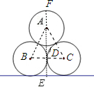 解:如图,三个等圆的圆心分别为A、B、C,过A作AD⊥BC于D,交地面于E,交⊙A于F,
