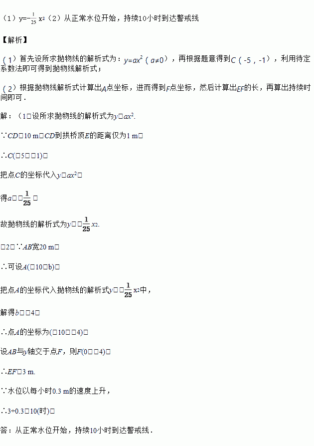 如图所示,有一座抛物线形拱桥,桥下面在正常水位时,AB宽20 m,水位上升到警戒线CD时,CD到拱桥顶E的距离仅为1 m,这时水面宽度为10 m.