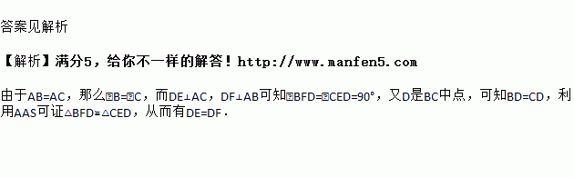 如图,在△ABC中,AB=AC,D为BC的中点,DE⊥AB,DF⊥AC,垂足分别为E、F,求证:DE=DF.