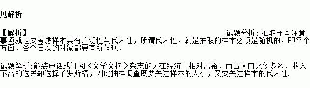 见解析 【解析】试题分析: 抽取样本注意事项就是要考虑样本具有广泛性与代表性,所谓代表性,就是抽取的样本必须是随机的,即各个方面,各个层次的对象都要有所体现. 试题解析:能装电话或订阅《文学文摘》杂志的人在经济上相对富裕,而占人口比例多数、收入不高的选民却选择了罗斯福,因此抽样调查既要关注样本的大小,又要关注样本的代表性.