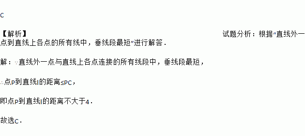 C 【解析】试题分析:根据“直线外一点到直线上各点的所有线中,垂线段最短”进行解答. 【解析】 ∵直线外一点与直线上各点连接的所有线段中,垂线段最短, ∴点P到直线l的距离≤PC, 即点P到直线l的距离不大于4. 故选C.