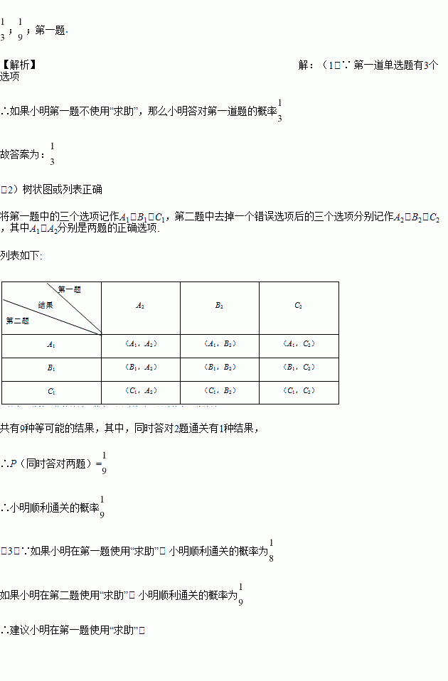 (1)如果小明第一题不使用“求助”,那么小明答对第一道题的概率是 .