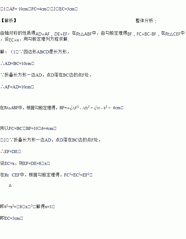 如图所示,折叠长方形一边AD,点D落在BC边的点F处,已知BC=10厘米,AB=8厘米,