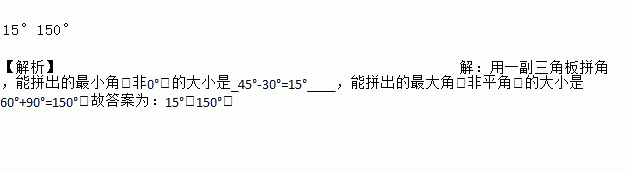 15° 150° 【解析】【解析】 用一副三角板拼角,能拼出的最小角(非0°)的大小是_45°-30°=15°____,能拼出的最大角(非平角)的大小是60°+90°=150°.故答案为:15°;150°.