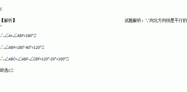如图,从A处出发沿北偏东60°方向行走至B处,又沿北偏西20°方向行走至C处,则∠ABC的度数是( ) .