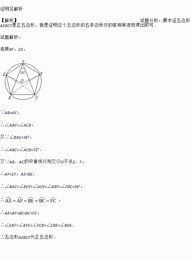 已知,如图,△ABC内接于⊙O,AB=AC,∠BAC=36°,AB、AC的中垂线分别交⊙O于点E、F,证明:五边形AEBCF是⊙O的内接正五边形.