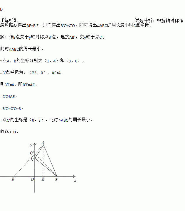 如图,在直角坐标系中,点A、B的坐标分别为(1,4)和(3,0),点C是y轴上的一个动点,且A、B、C三点不在同一条直线上,当△ABC的周长最小时,点C的坐标是( )