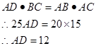 (8分)在△ABC中,∠BAC=900,AB=20,AC=15,AD⊥BC,垂足为D,![]()