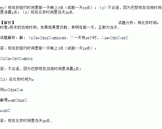 (1)现在的纽约时间是前一天晚上7点(或前一天19点);(2)不合适,因为巴黎现在当地时间是凌晨1点;(3)现在北京时间是当天20点. 【解析】试题分析:用北京时间+时差=所求的当地时间,如果结果是负数,表明在前一天,正数为当天. 试题解析:【解析】 (1)8+(﹣13)=8﹣13=﹣5.∵一天有24小时,∴24+(﹣5)=19. 答:现在的纽约时间是前一天晚上7点(或前一天1...