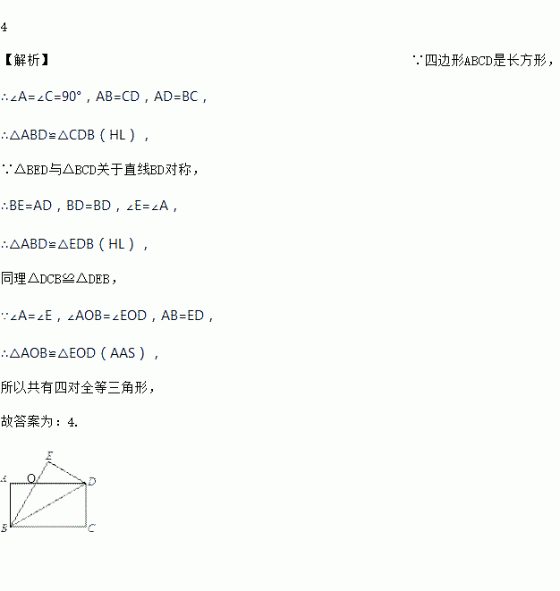如图,四边形ABCD为长方形,△BED与△BCD关于直线BD对称,则图中共有______对全等三角形.