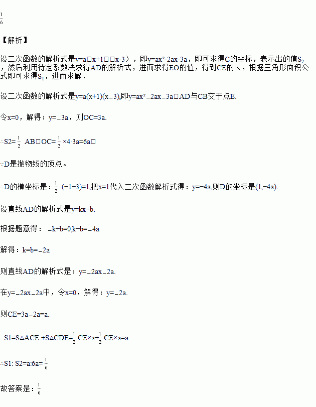 如图,在平面直角坐标系中,过A(-1,0)、B(3,0)两点的抛物线交y轴于点C,其顶点为点D,设△ACD的面积为S1,△ABC的面积为S2.小芳经探究发现:S1︰S2是一个定值.这个定值为________.