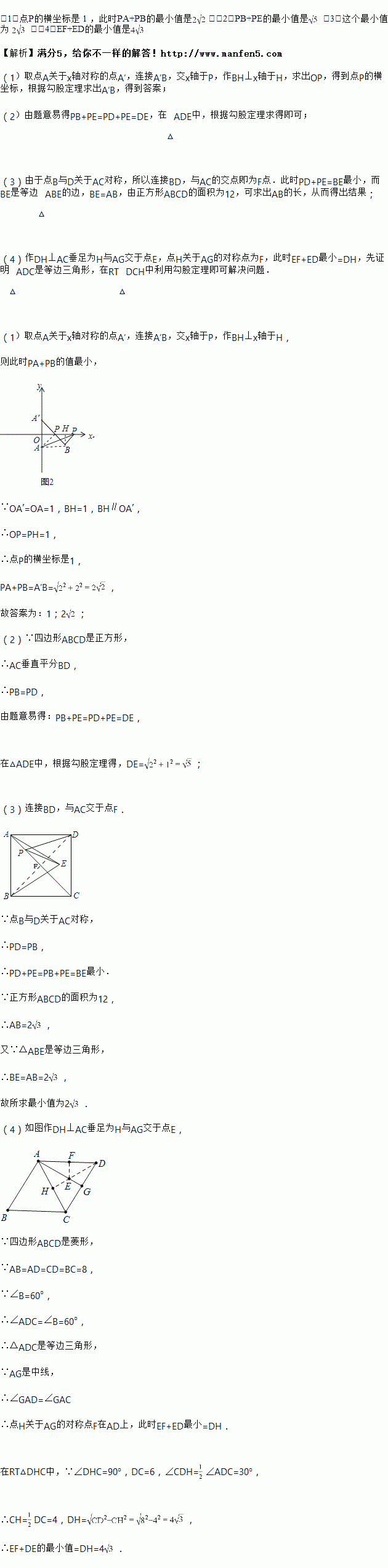 (3)如图4,正方形ABCD的面积为12,△ABE是等边三角形,点E在正方形ABCD内,在对角线AC上有一动点P,则PD+PE的最小值为 ;