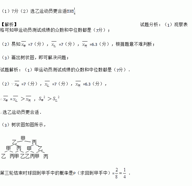 垫球是排球队常规训练的重要项目之一.下列图表中的数据是甲、乙、丙三人每人十次垫球测试的成绩.测试规则为连续接球10个,每垫球到位1个记1分.