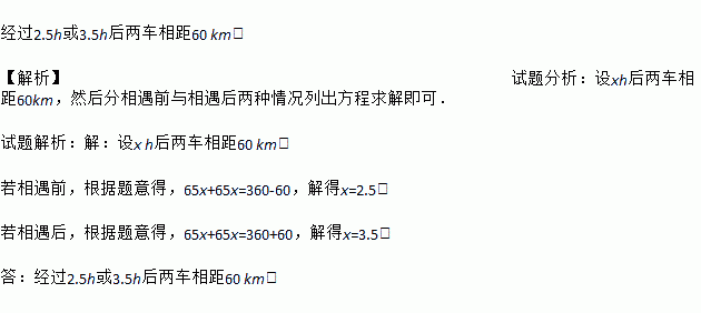 经过2.5h或3.5h后两车相距60 km. 【解析】试题分析:设xh后两车相距60km,然后分相遇前与相遇后两种情况列出方程求解即可. 试题解析:【解析】 设x h后两车相距60 km. 若相遇前,根据题意得,65x+65x=360-60,解得x=2.5; 若相遇后,根据题意得,65x+65x=360+60,解得x=3.5; 答:经过2.5h或3.5h后两车相距6...