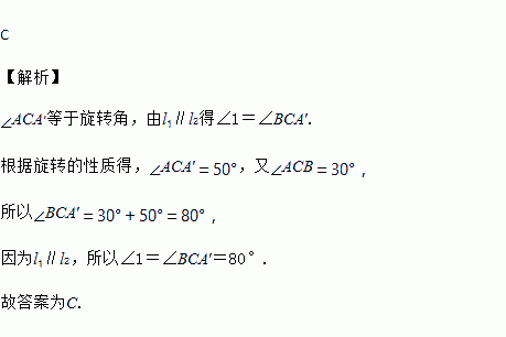 如图,已知l1∥l2,把一块含30°角的直角三角板ABC按图所示的方式摆放,边BC在直线l2上,将三角板绕点C顺时针旋转50°,则∠1的度数为( )