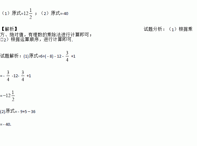 计算:(1)6÷( - 2)3 - | - 22×3| - 3÷2×+1;(2)-32+( - 4)×( - 5)×0.25 - 6÷.