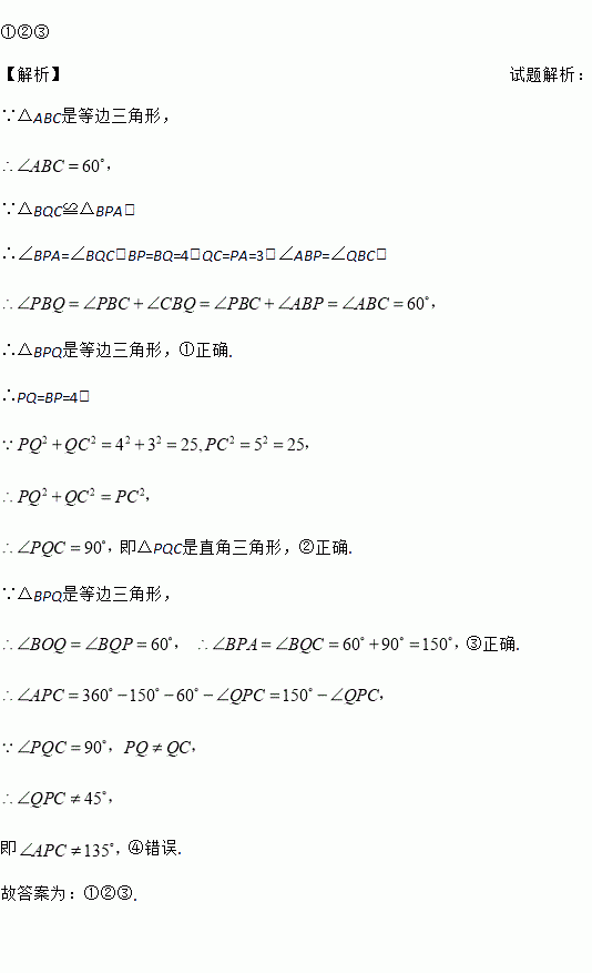 ①△BPQ是等边三角形 ②△PCQ是直角三角形 ③∠APB=150° ④∠APC=135°
