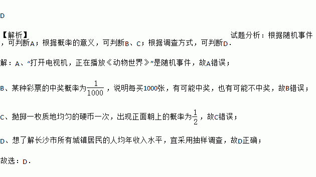 D ¡¾½âÎö¡¿ÊÔÌâ·ÖÎö£º¸ù¾ÝËæ»úʼþ£¬¿ÉÅжÏA£»¸ù¾Ý¸ÅÂʵÄÒâÒ壬¿ÉÅжÏB¡¢C£»¸ù¾Ýµ÷²é·½Ê½£¬¿ÉÅжÏD£® ¡¾½âÎö¡¿ A¡¢¡°´ò¿ªµçÊÓ»ú£¬ÕýÔÚ²¥·Å¡¶¶¯ÎïÊÀ½ç¡·¡±ÊÇËæ»úʼþ£¬¹ÊA´íÎó£» B¡¢Ä³ÖÖ²ÊÆ±µÄÖн±¸ÅÂÊΪ£¬ËµÃ÷ÿÂò1000ÕÅ£¬ÓпÉÄÜÖн±£¬Ò²ÓпÉÄܲ»Öн±£¬¹ÊB´íÎó£» C¡¢Å×ÖÀһöÖʵؾùÔȵÄÓ²±ÒÒ»´Î£¬³öÏÖÕýÃæ³¯ÉϵĸÅÂÊΪ£¬¹ÊC´íÎó£» D¡¢ÏëÁ˽ⳤɳÊÐËùÓгÇÕò¾ÓÃñµÄÈ˾ùÄêÊÕÈë...