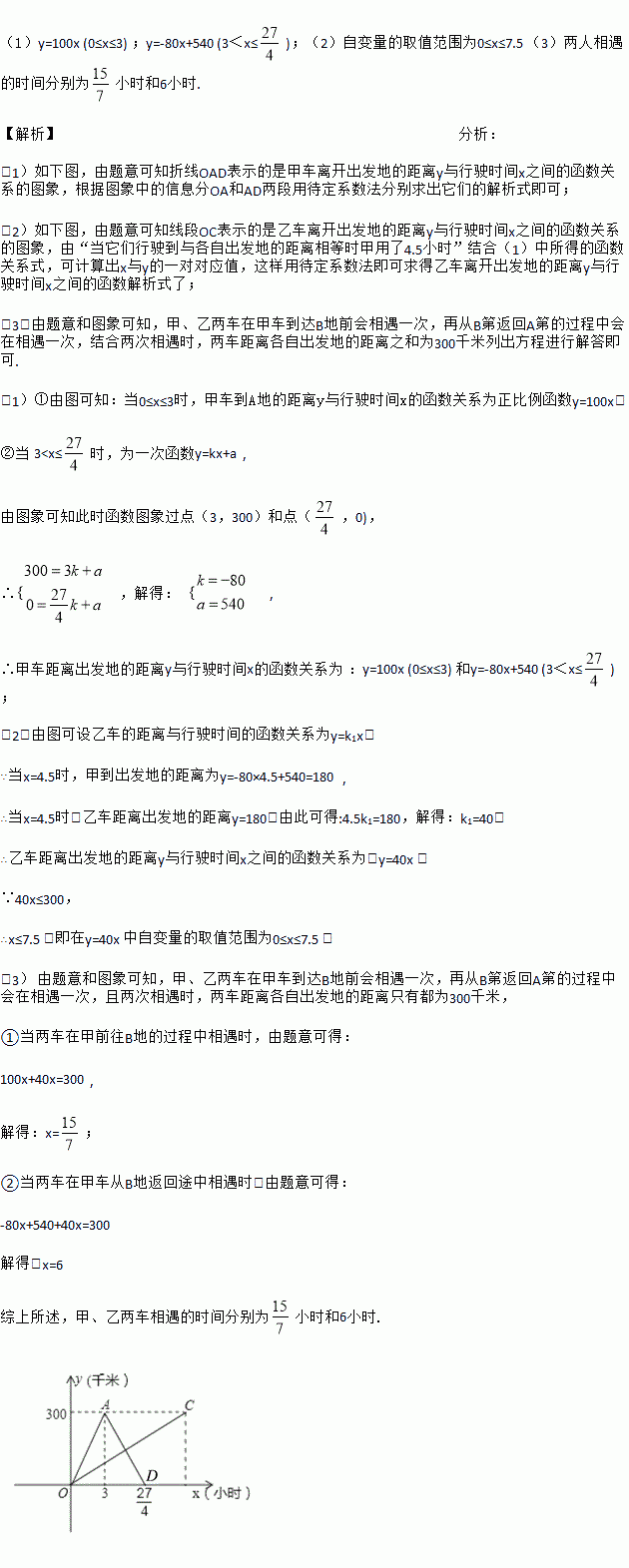 已知甲. 乙两车分别从相距300km的A. B两地同时出发,相向而行,其中甲到B地后立即返回,下图是它们离各自出发地的距离y(km)与行驶时间x(h)之间的函数图象.