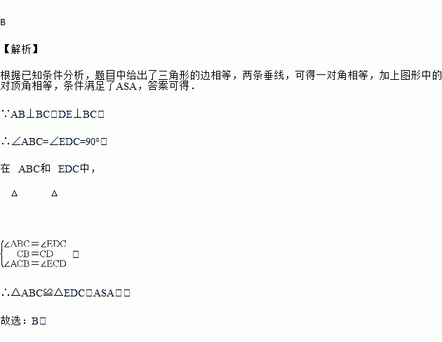 如图,要测量河两岸相对的两点A、B间的距离,先在过点B的AB的垂线l上取两点C、D,使,再在过D的垂线上取点E,使A、C、E在一条直线上,这时![]()