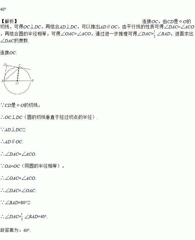 如图,已知AB是⊙O的直径,点C在⊙O上,AD垂直于过点C的切线,垂足为D,且∠BAD=80°,则∠DAC的度数是_____________.