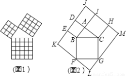 在我国古算书《周髀算经》中就有“若勾三,股四,则弦五”的记载.如图1是由边长相等的小正方形和直角三角形构成的,可以用其面积关系验证勾股定理.图2是由图1放入长方形内得到的,∠BAC=90°,AB=6,AC=8,点D,E,F,G,H,I都在长方形KLMJ的边上,则长方形KLMJ的面积为(