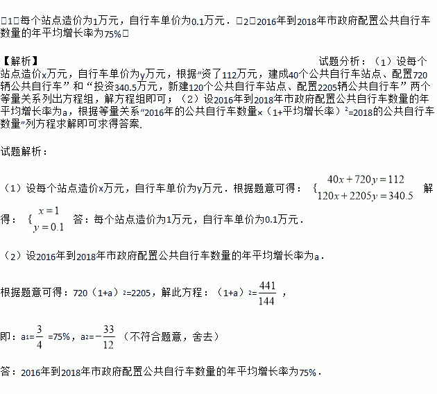 (1)每个站点造价为1万元,自行车单价为0.1万元.(2)2016年到2018年市政府配置公共自行车数量的年平均增长率为75%. 【解析】试题分析:(1)设每个站点造价x万元,自行车单价为y万元,根据“资了112万元,建成40个公共自行车站点、配置720辆公共自行车”和“投资340.5万元,新建120个公共自行车站点、配置2205辆公共自行车”两个等量关系列出方程组,解方程组即可;(2)设2...