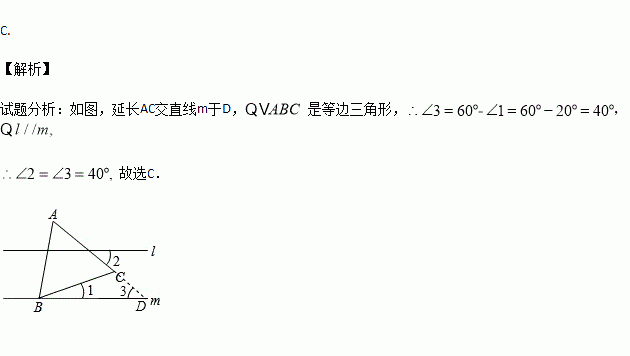 如图,l∥m,等边△ABC的顶点B在直线m上,∠1=20°,则∠2的度数为( )