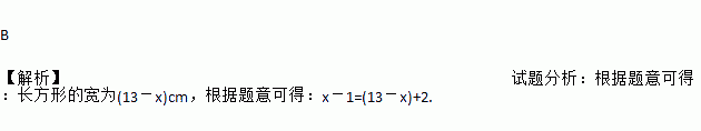 B 【解析】试题分析:根据题意可得:长方形的宽为(13-x)cm,根据题意可得:x-1=(13-x)+2.
