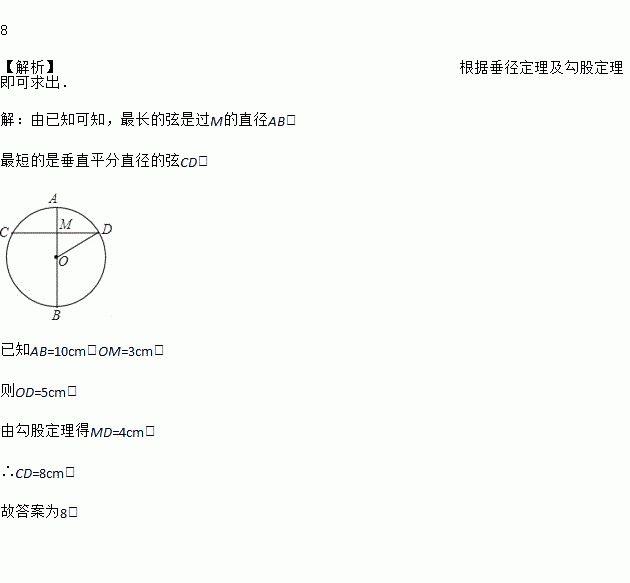 8 【解析】根据垂径定理及勾股定理即可求出. 【解析】 由已知可知,最长的弦是过M的直径AB, 最短的是垂直平分直径的弦CD, 已知AB=10cm,OM=3cm, 则OD=5cm, 由勾股定理得MD=4cm, ∴CD=8cm, 故答案为8.
