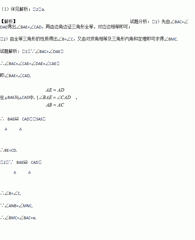 查看答案已知:如图,AB=AC,AD=AE,∠BAC=∠DAE=α,BE与AC、CD分别相交于点N、M.