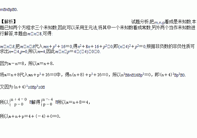 若m,n,p满足m-n=8,mn+p2+16=0,求m+n+p的值.