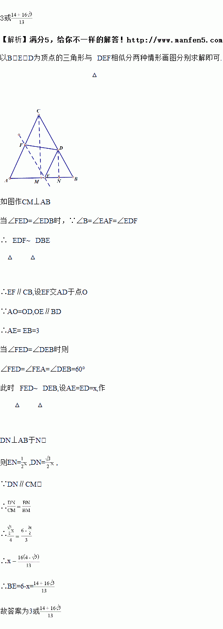 已知△ABC中,AB=6,AC=BC=5,将△ABC折叠,使点A落在BC边上的点D处,折痕为EF(点E.F分别在边AB、AC上).当以B.E.D为顶点的三角形与△DEF相似时,BE的长为_____.