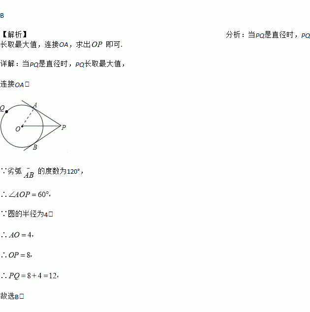 如图,PA,PB分别切⊙O于A,B两点,已知圆的半径为4,劣弧的度数为120°,Q是圆上的一动点,则PQ长的最大值是( )