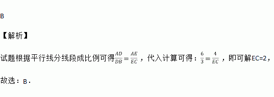 如图,在△ABC中,DE∥BC,AD=6,DB=3,AE=4,则EC的长为( )