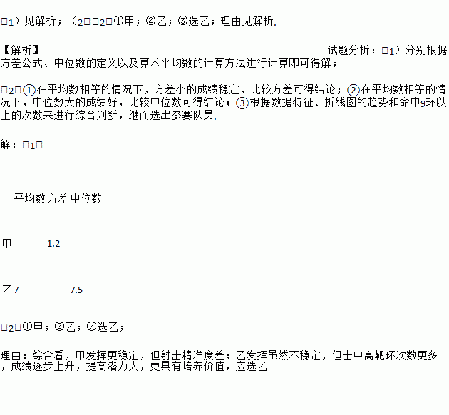 (1)见解析;(2)(2)①甲;②乙;③选乙;理由见解析. 【解析】试题分析:(1)分别根据方差公式、中位数的定义以及算术平均数的计算方法进行计算即可得解; (2)①在平均数相等的情况下,方差小的成绩稳定,比较方差可得结论;②在平均数相等的情况下,中位数大的成绩好,比较中位数可得结论;③根据数据特征、折线图的趋势和命中9环以上的次数来进行综合判断,继而选出参赛队员. 【解析】 ...